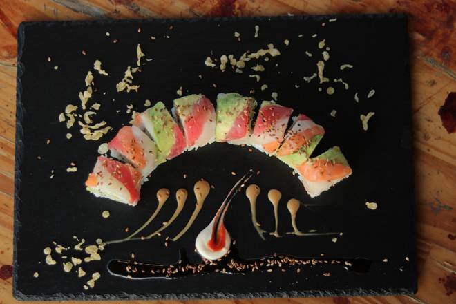 Rollo relleno de surimi, pepino y aguacate, cubierto de salmón, tilapia, atún y semillas de ajonjolí. Contenido; 1 salsa de soya, 1 gari pink, 1 wasabi, 1 sobre de palillos.