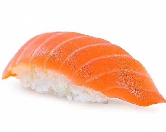 Lonjas de salmón montada sobre un bolita de arroz de sushi, acompañados de wasabi y gari pink.
