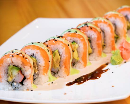 California roll cubierto de salmón y salsa wasabi. Ahumando lo tradicional con la fusión.