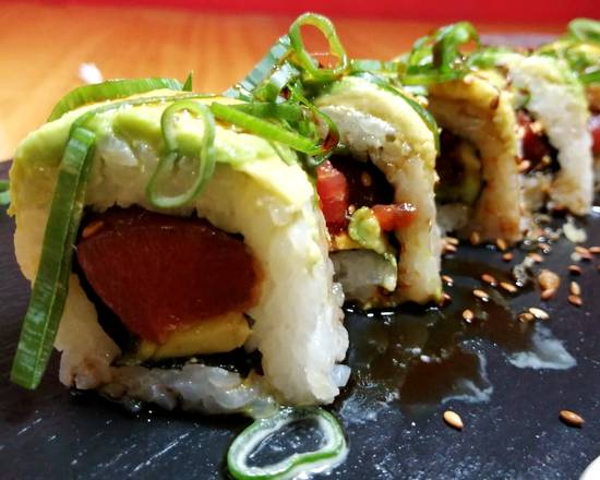 Rollo relleno de atún picante y aguacate, bañado de semillas de ajonjolí. Contenido; 1 salsa de soya, 1 gari pink, 1 wasabi, 1 sobre de palillos.