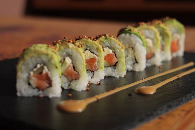 Cobertura de aguacate relleno de salmón, surimi, cebollino, queso crema y nijin teriyaki
