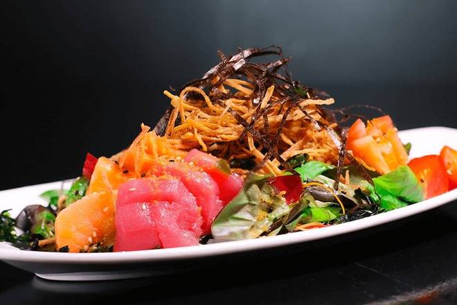 Lechugas Mixtas, tomate, pepino, kizami de zanahoria y remolacha con con Sashimi de Salmón, atún y surimi con aderezo de la casa.