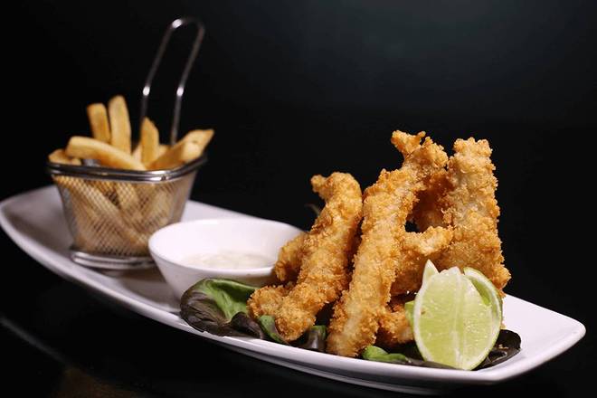 Dedos de pescado empanizados, acompañados de papas fritas, en la salsa que tu prefieras.