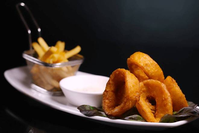 Deliciosos aros de cebolla empanizados con panko en salsa Golden Miel.