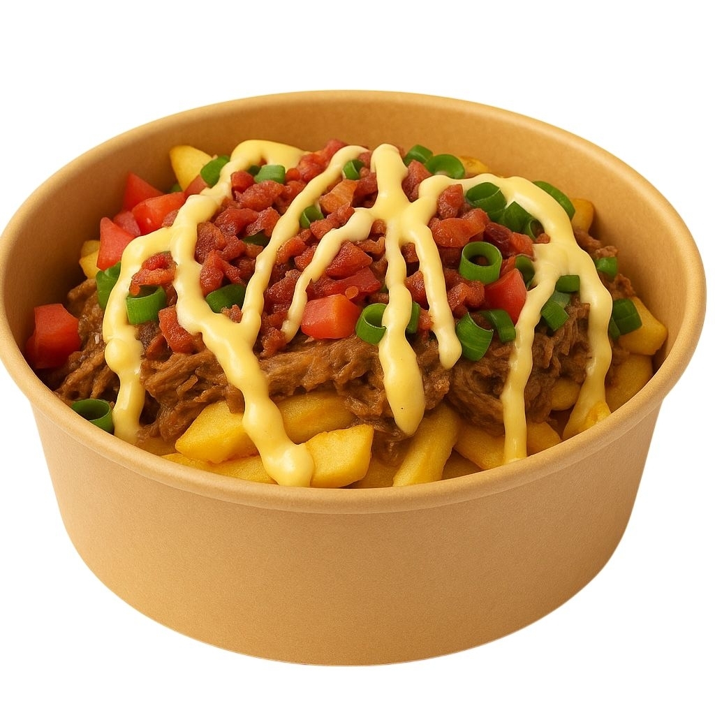 200 g De papas , 100g de carne de res, Bacon, queso mozzarella, natilla, cebollino, salsa tomate mayonesa y salsa de la casa.