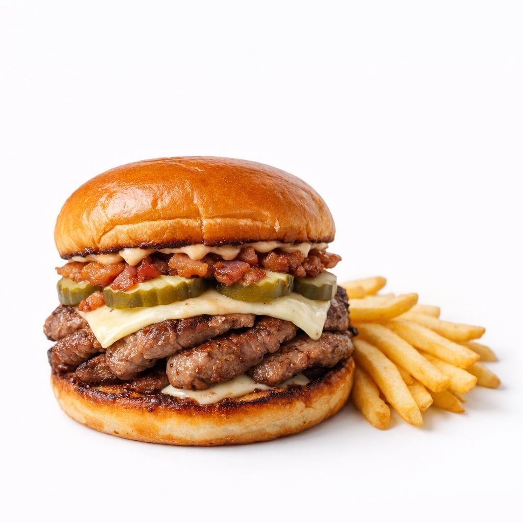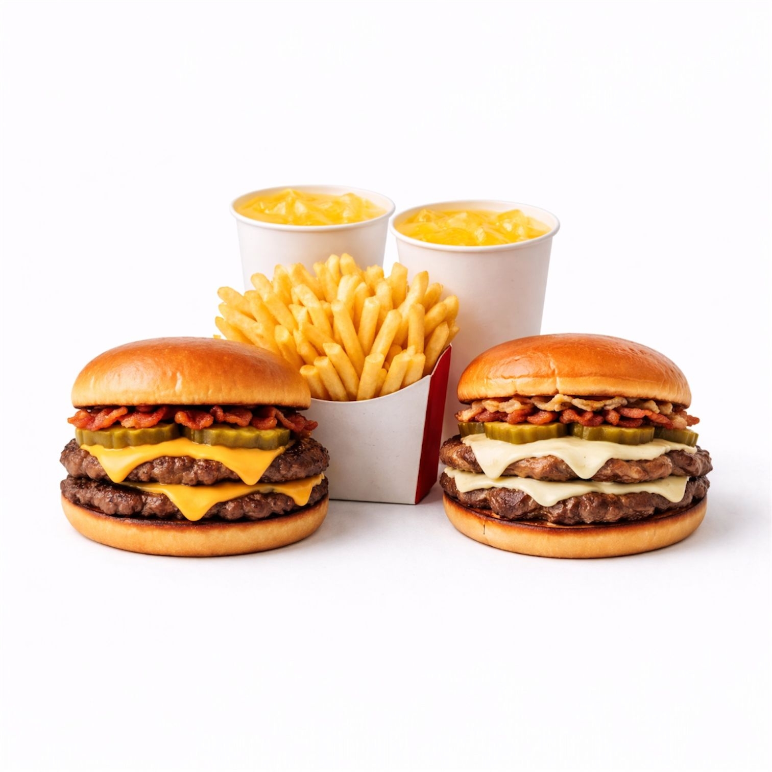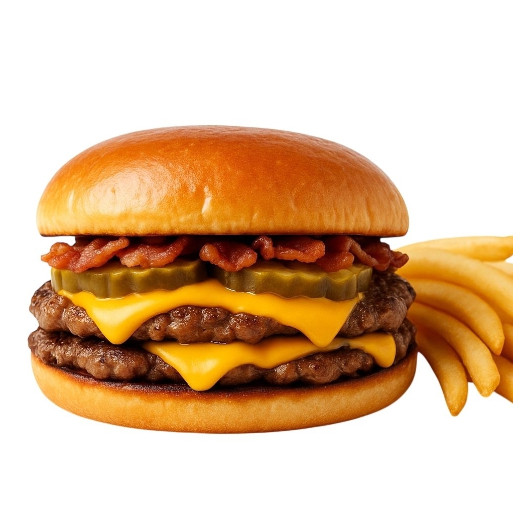 Incluye Papas 80gr y refresco de mang Doble torta de res smash, doble queso amarillo, pepinillos, bacon y salsa clásica crunch con cebolla, más 80g de fríes..
