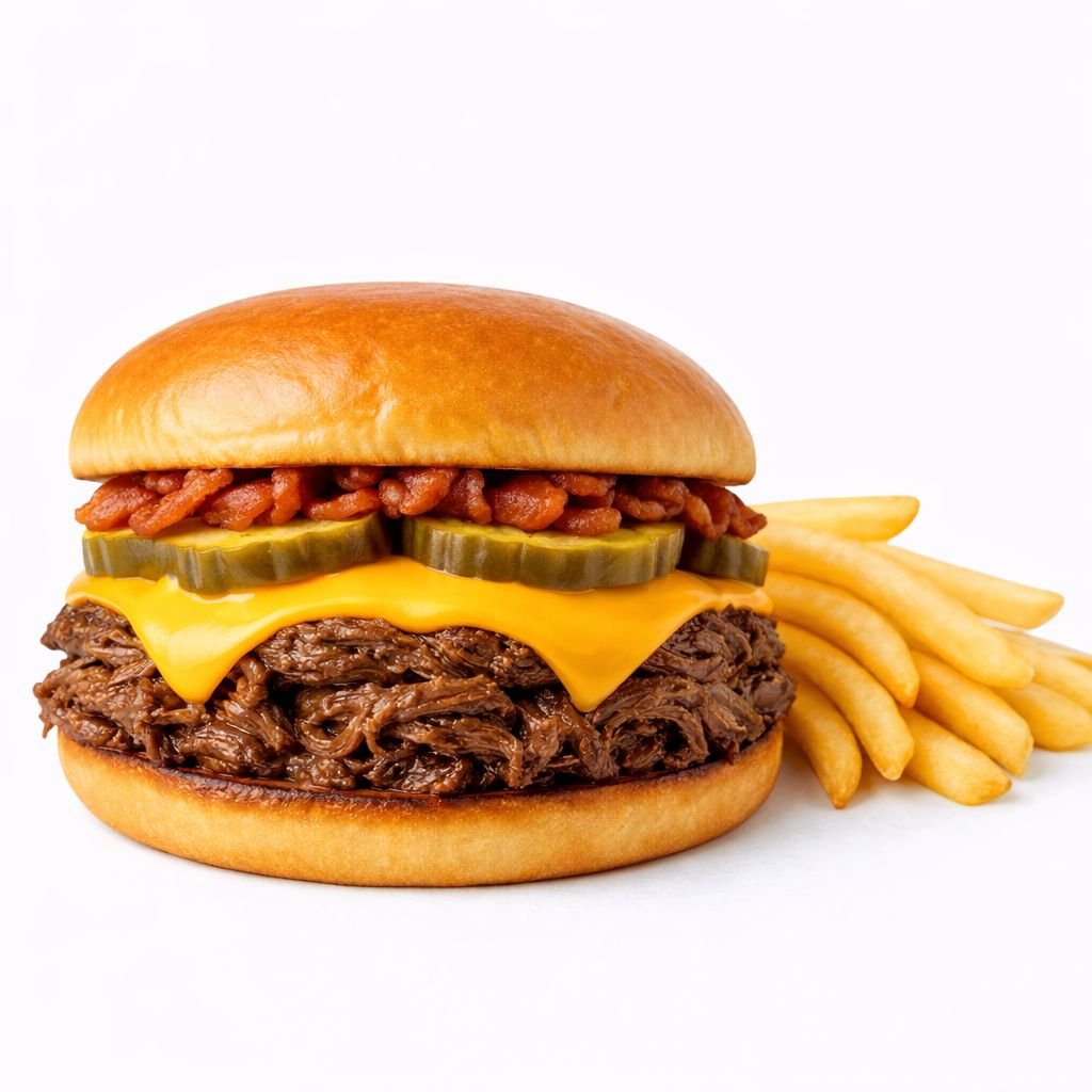 Incluye Papas 80gr y refresco de mango 150gr Carne mechada, queso amarillo, pepinillos, bacon, acompañada de 80gr de fries