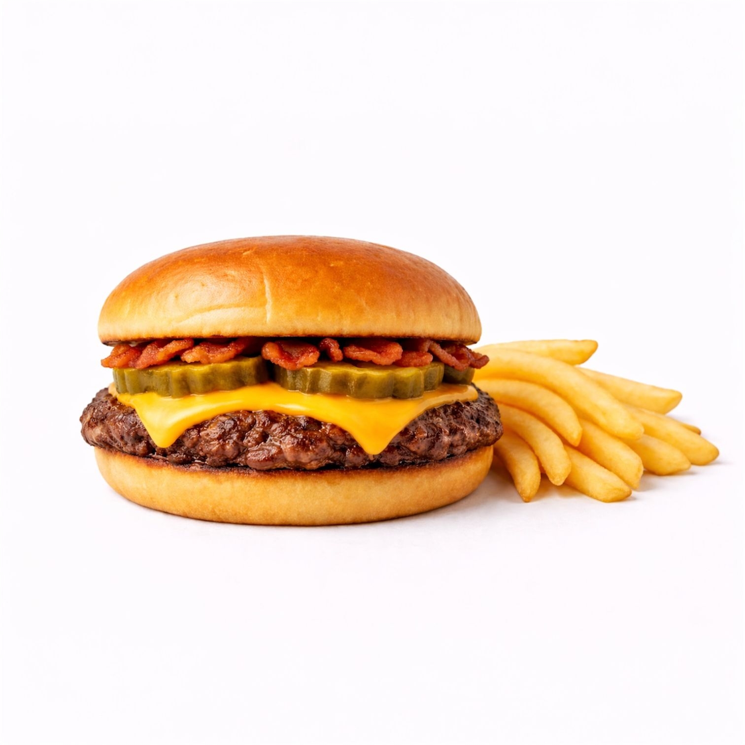 Incluye Papas 80gr y refresco de mango 150 g Carne de punta solomo, queso mozzarella, pepinillos y salsa OnlyBacon más 80g de fríes..