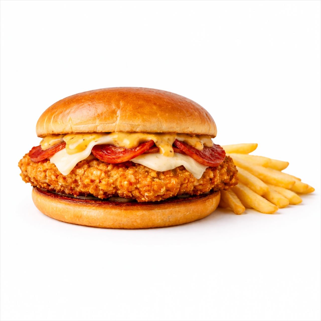 Incluye 80gr papas refresco de mango Milanesa de pechuga de pollo, peperoni, queso mozzarella, pepinillos y salsa mostaza miel más 80g de fríes..