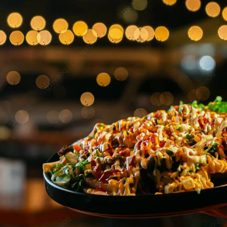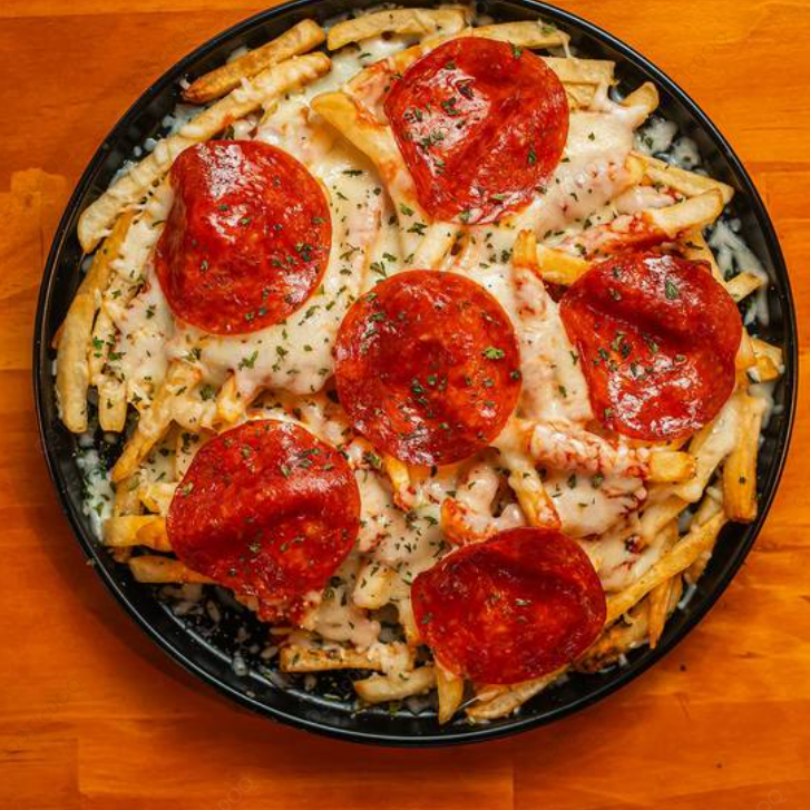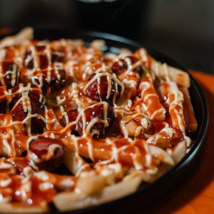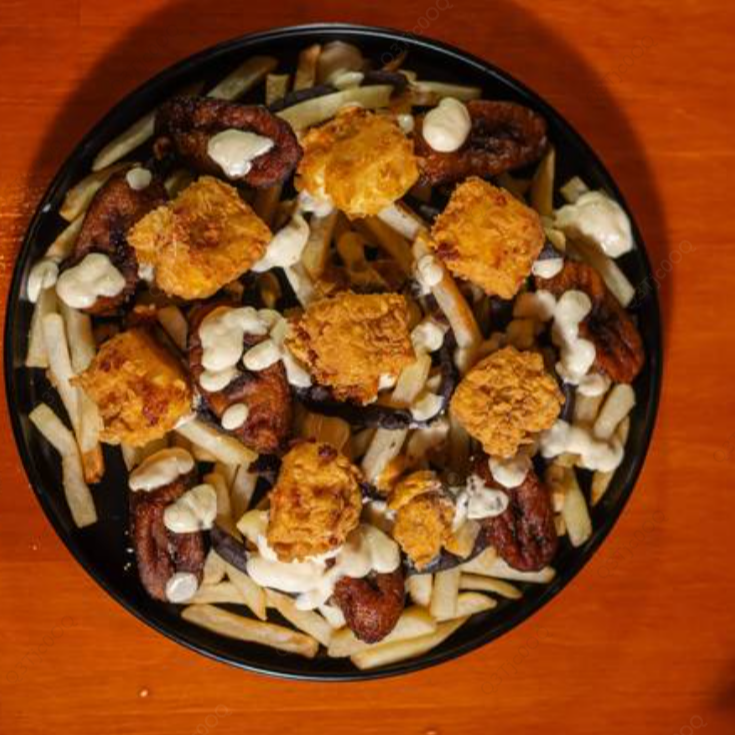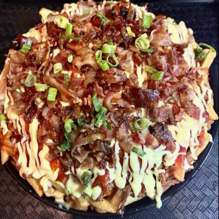 1 kg De papas acompañadas de carne mechada, salsa de tomate, queso mozzarella, mayonesa de la casa cebollín y tocineta.