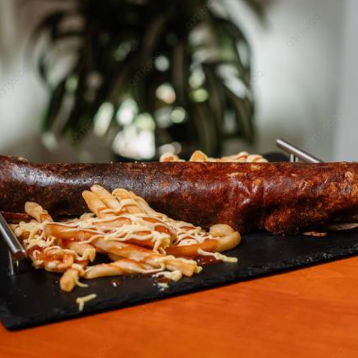 Taco de 40 cm de largo, relleno de 200 g de carne mechada envuelto en una costra de queso acompañado de papas con salsa de tomate y mayonesa de la casa.