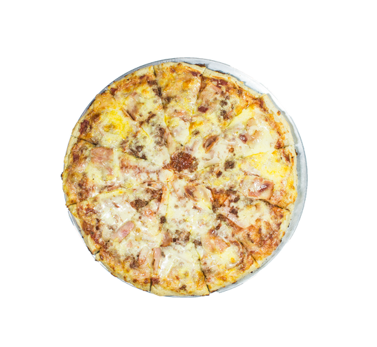 Pizza de 6 porciones. Ingredientes: tocineta, jamón, piña y queso mozzarella.