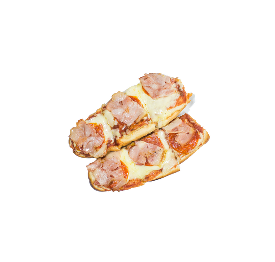 En pan francés, con nuestra deliciosa salsa pizza, queso mozzarella, pepperoni, salame y tocineta.