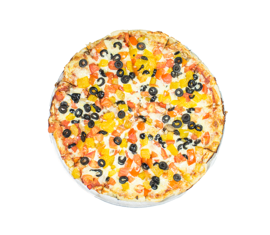 Pizza de 8 porciones. Ingredientes: chile dulce, cebolla, hongos, tomate, piña, aceitunas negras y queso mozzarella.