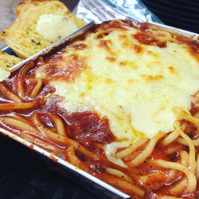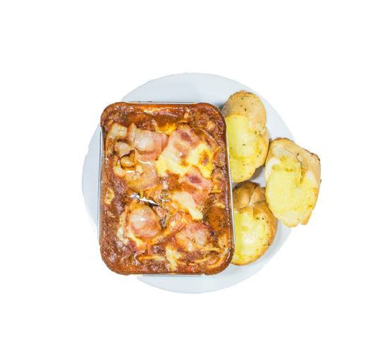 Salsa roja, espagueti, chile dulce, cebolla, hongos, carne molida, salame, jamón, doble queso mozarella y tocineta.