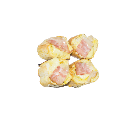 Deliciosa mantequilla de ajo con pan baguette con un toque especial queso mozzarella y tocineta.