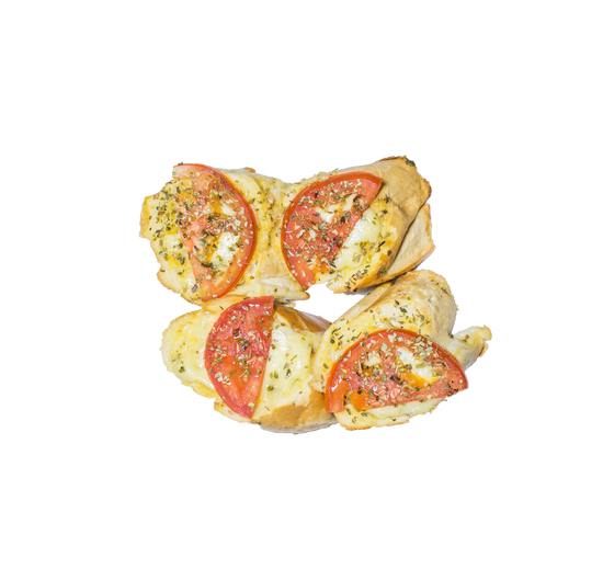 Deliciosa mantequilla de ajo con pan baguette con queso mozzarella, orégano, tomate y una pizca de aceite de oliva.