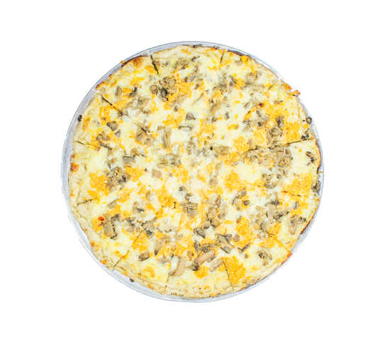 Pizza de 8 porciones. Ingredientes: salsa blanca, pollo, hongos, parmesano y queso mozzarella.