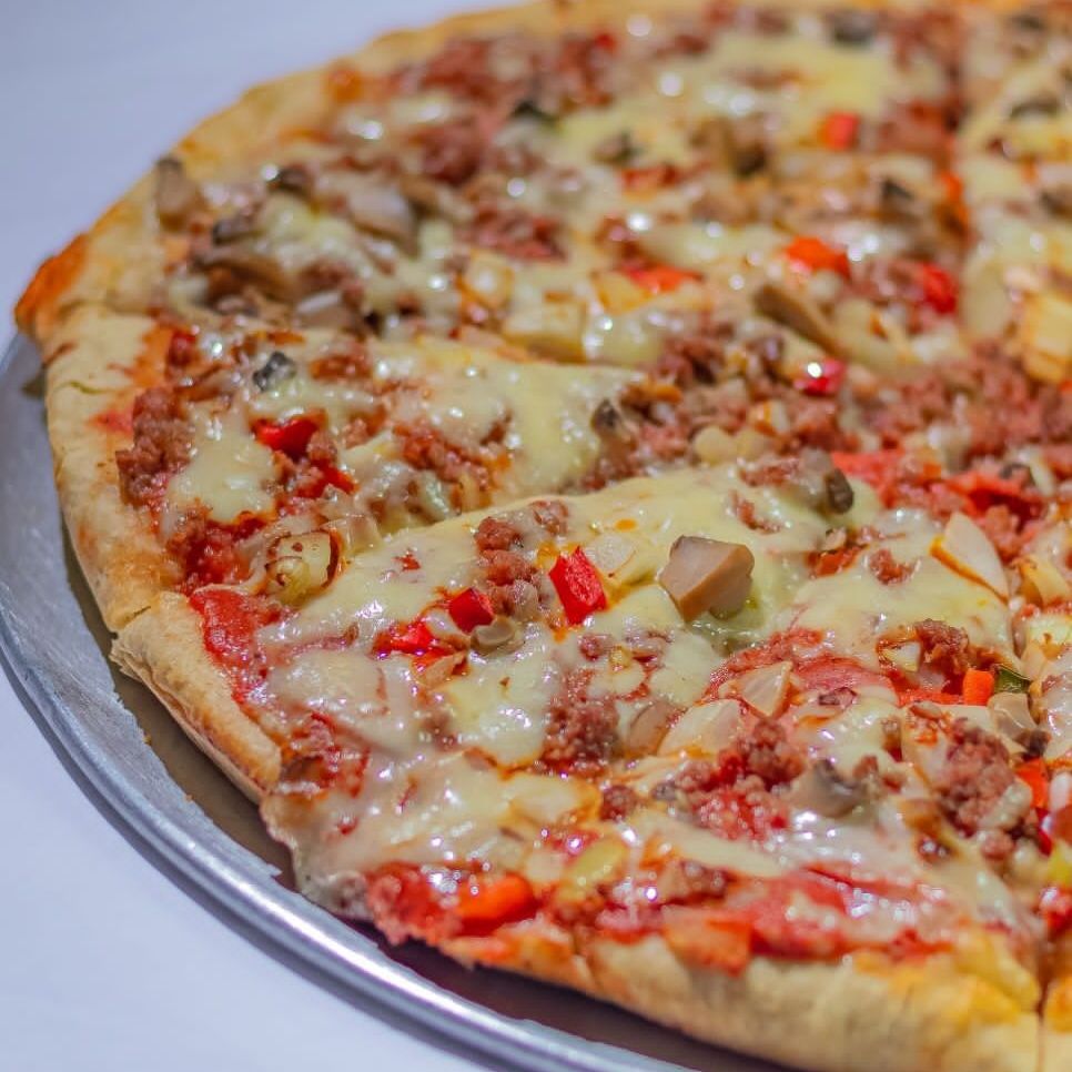 Pizza de 16 porciones. Ingredientes: salami, chile dulce, cebolla, carne molida, hongos y queso mozzarella.