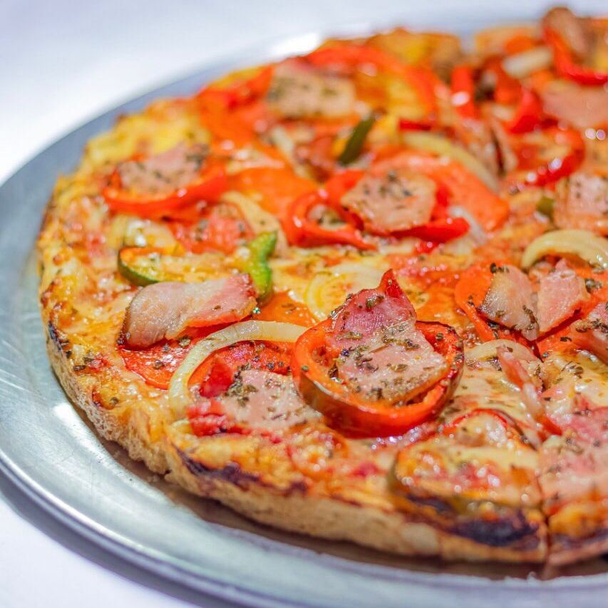 Pizza de 8 porciones. Ingredientes: pepperoni, chile dulce, cebolla, aderezo, orégano, tocineta, hongos y queso mozzarella.