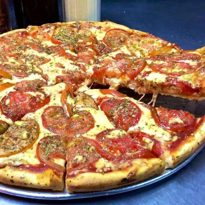 Pizza de 12 porciones. Ingredientes: tomate en rodajas, orégano, aceite de oliva y queso mozzarella.