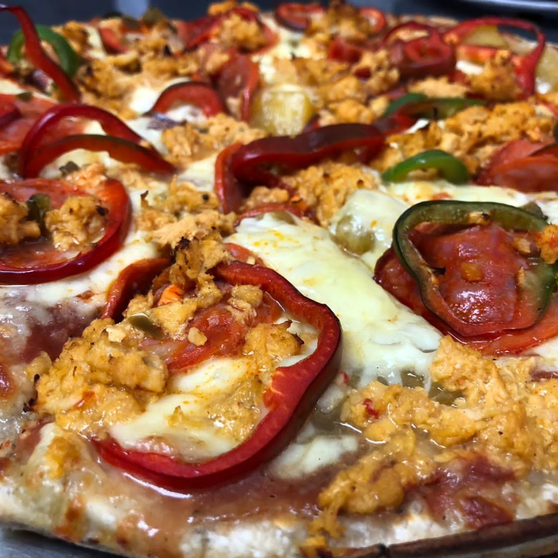 Pizza de 12 porciones. Ingredientes: pepperoni, carne molida, pollo, chile dulce en rodajas, piña, chile picante y queso mozzarella.