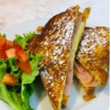 Pan brioche, jamón de pavo, queso mozzarella, aderezo de arándanos, azúcar glass