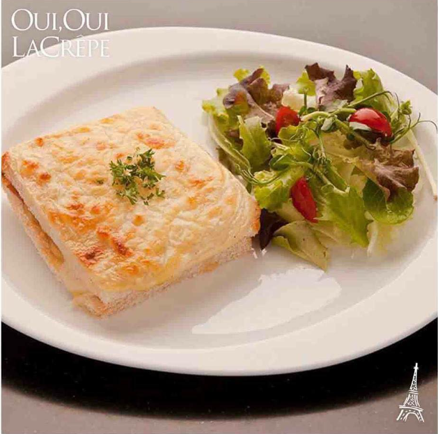 Jamón y queso gratinado con salsa blanca y queso, acompañado de ensalada verde