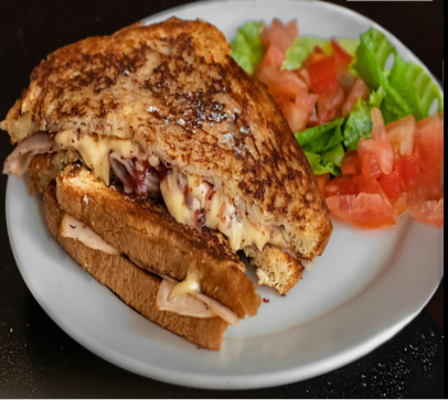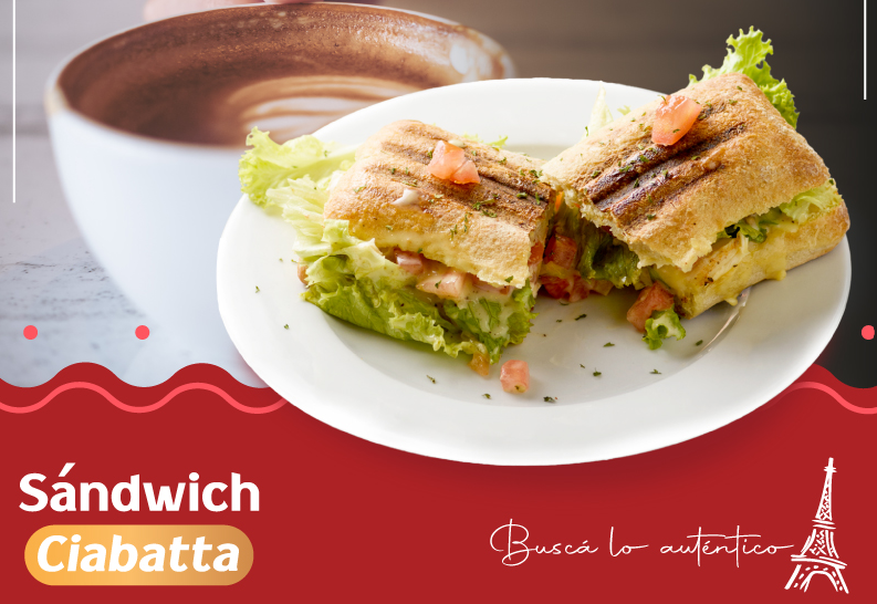 Pan Ciabatta, queso mozzarella, pollo, mantequilla, lechuga, tomate y aderezo mostaza miel