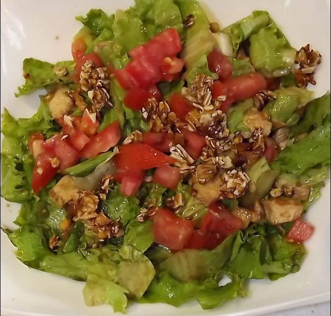 Pechuga de Pollo o Roast Beef, hojas de espinaca frescas, salsa blanca, queso mozzarella, tomate y hongos con aderezo mostaza miel