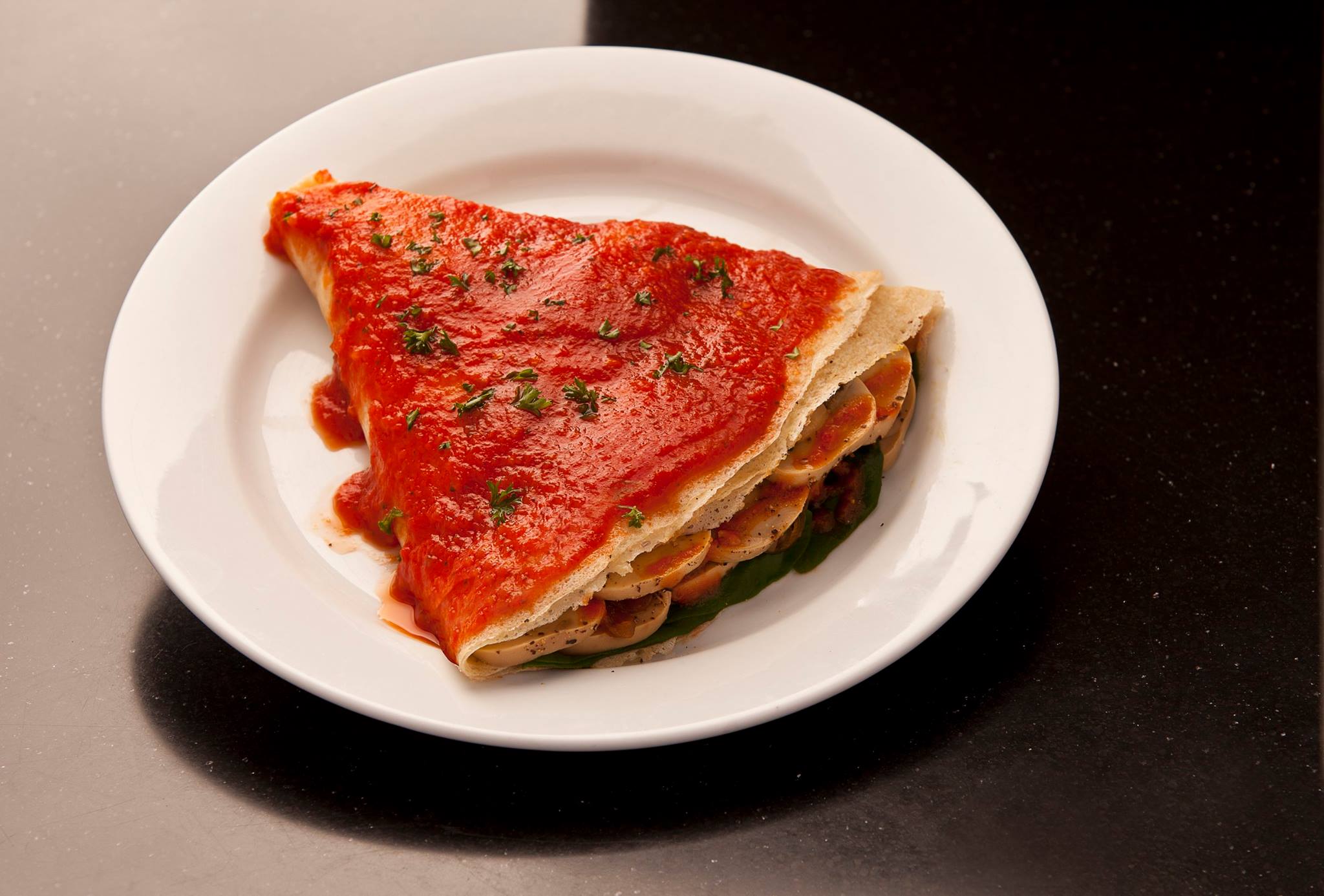 Espinacas cocinadas, hongos y cebolla caramelizada con salsa de tomate natural
