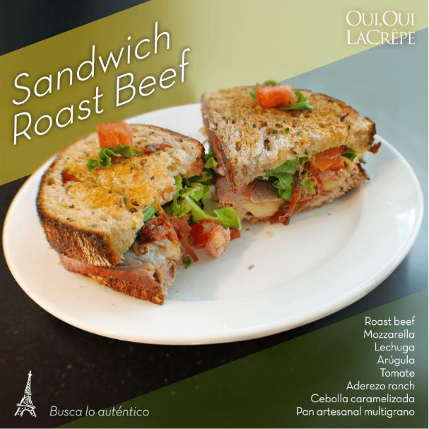 Roast Beef, queso, cebolla caramelizada, arúgula, tomate y aderezo ranch