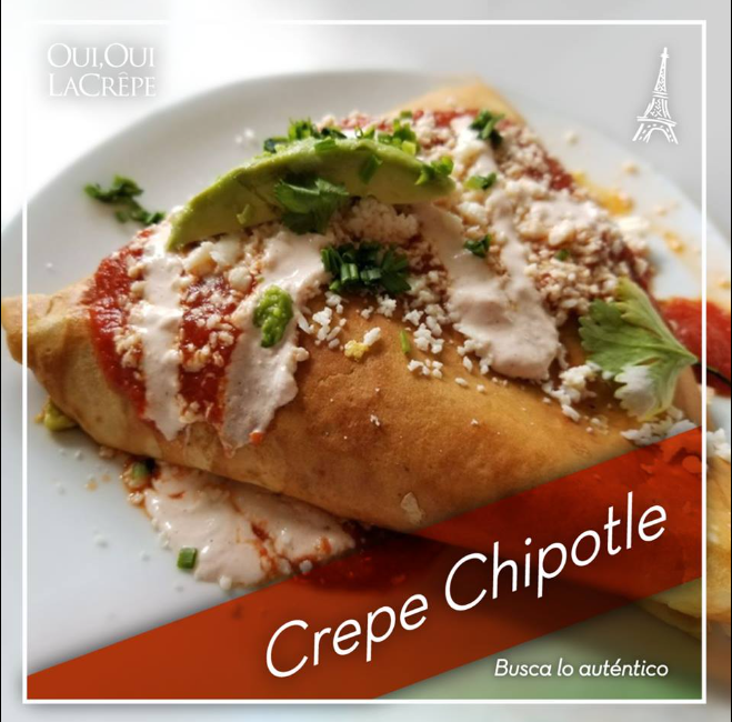 Queso, frijoles molidos, carne mechada o pollo, pico de gallo, lechuga, natilla, aguacate y salsa chipotle