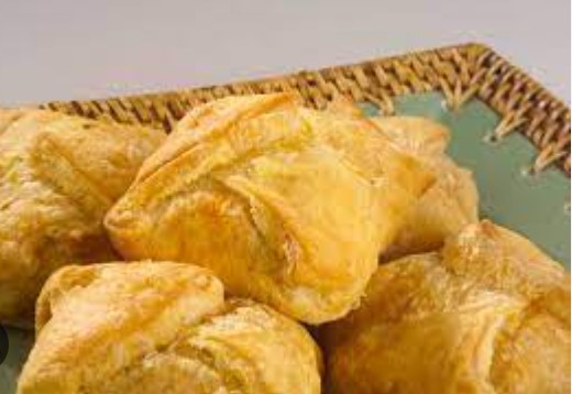 Pasta de hojaldre relleno de pollo mechado en forma de arrollado.