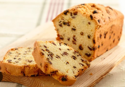 Pan en forma cuadrada relleno de jalea con pasas.