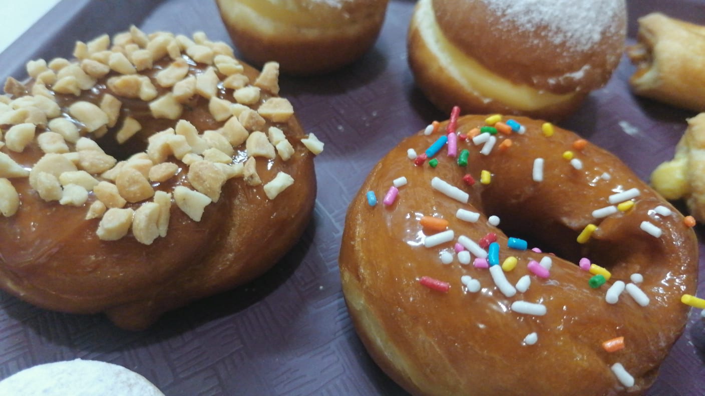 Donas de masa dulce, rellenas de dulce de leche y confitería por encima.