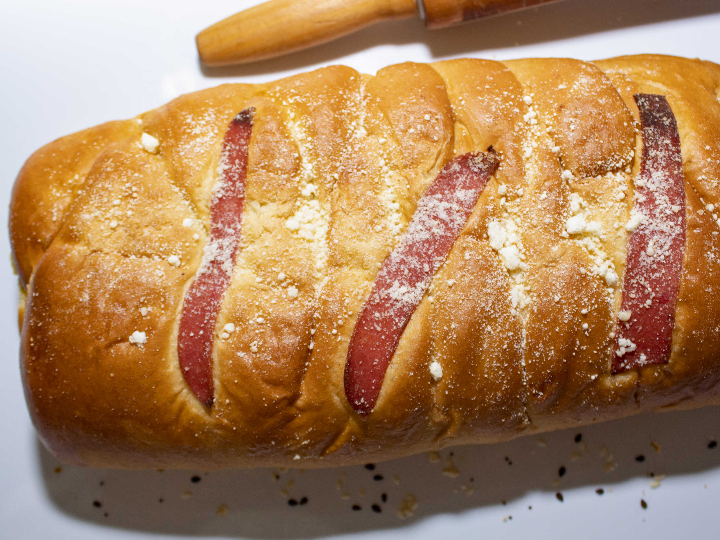 Trenza salada rellena con frijol molido, queso y carne desmechada.