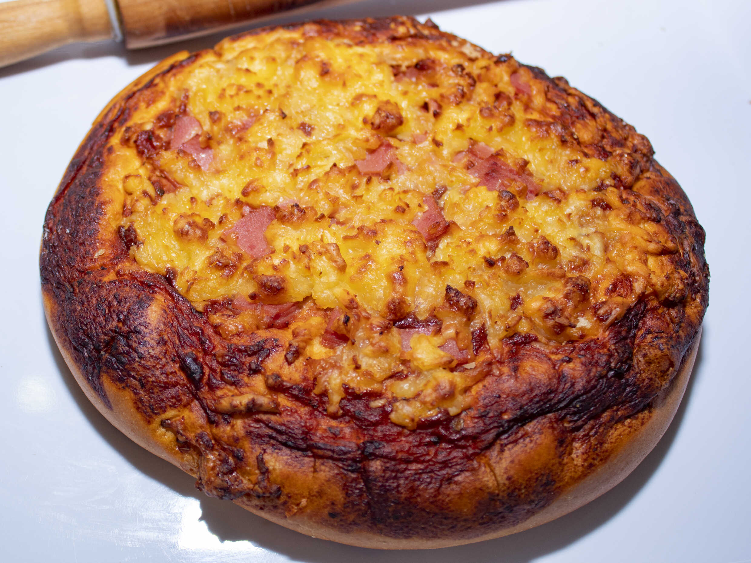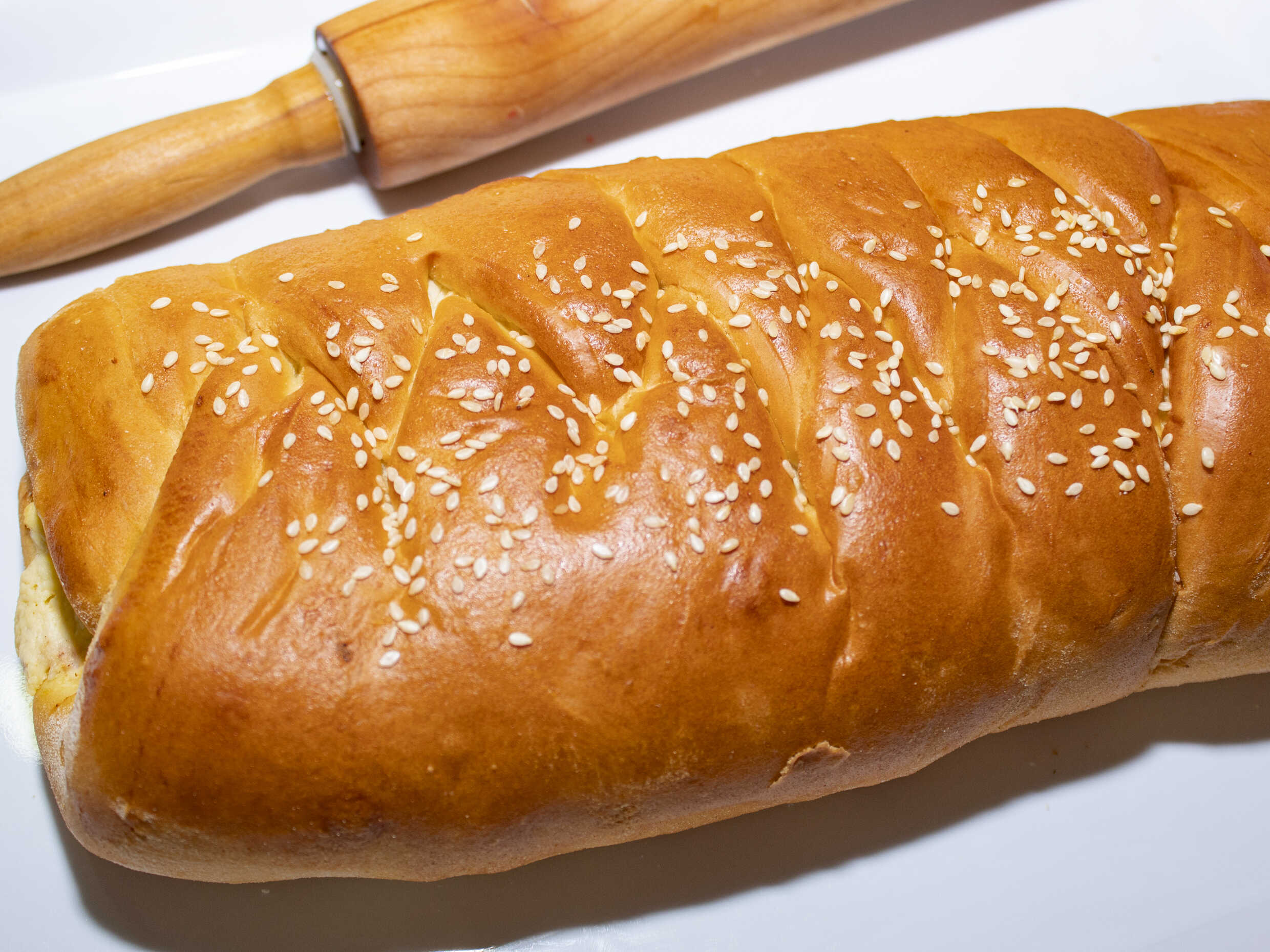 Trenza salada rellena con salsa pizza, jamón y queso.