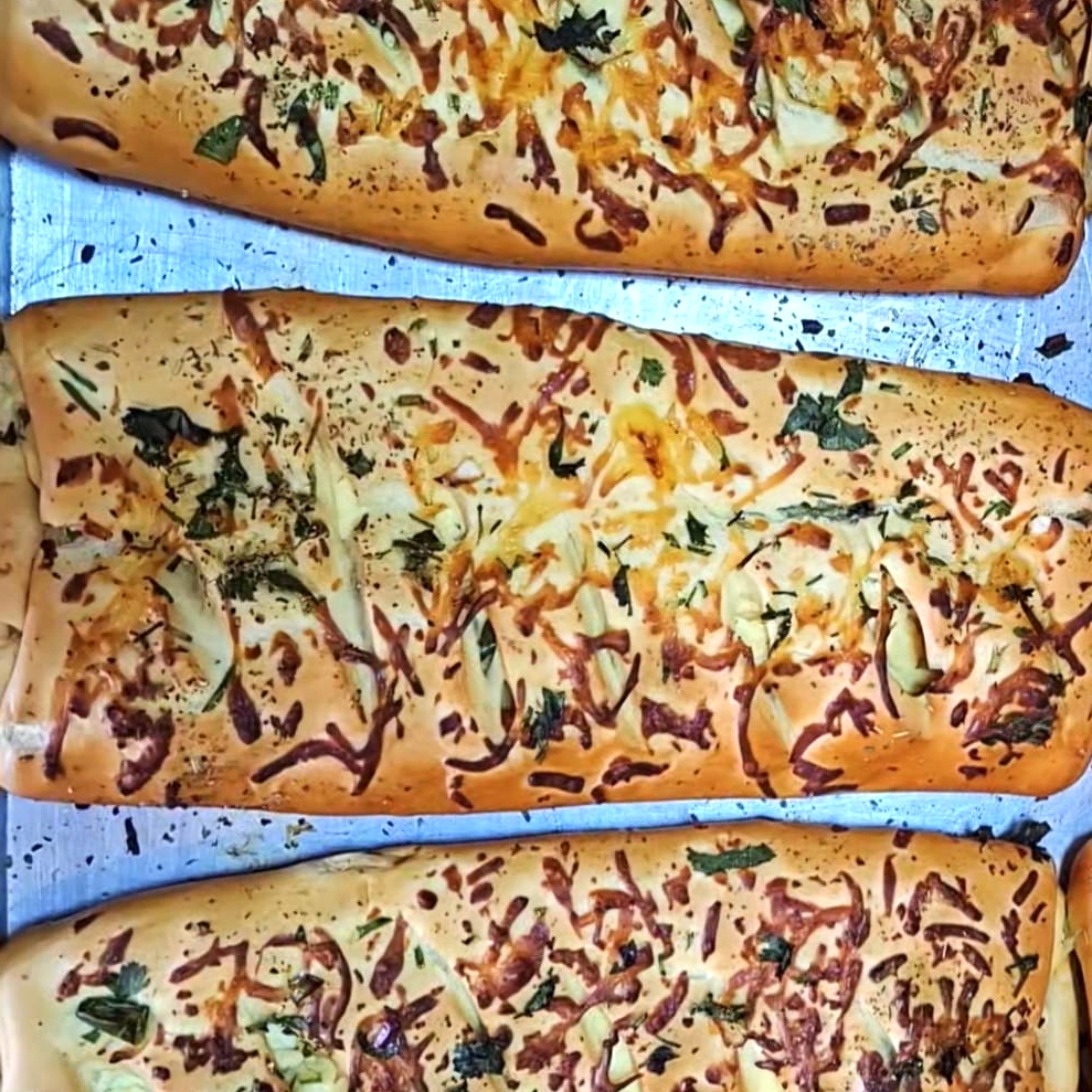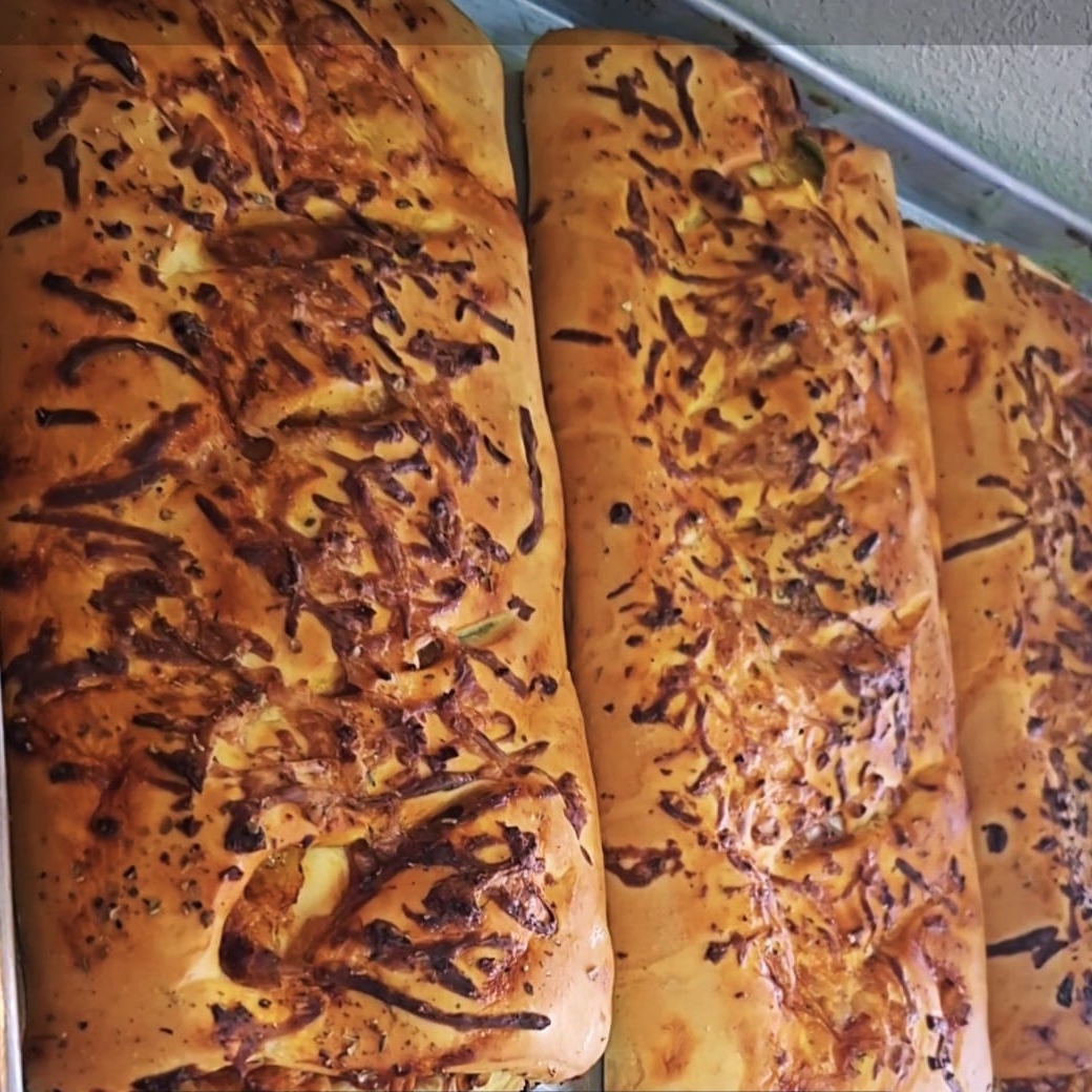 Pasta hojaldre con relleno de pollo mechado.