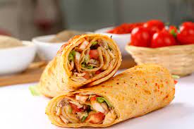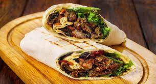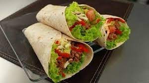 Tortilla de trigo, frijoles molidos, lechuga, queso, natilla y salsas. Pollo y carne.