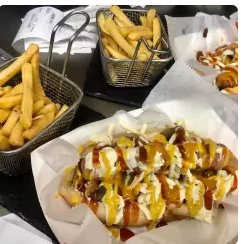 Salchicha, papitas ralladas, tocineta, queso mozzarella y salsas. Incluye papas fritas.