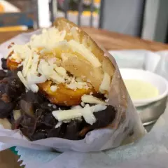 Carne mechada, frijoles, plátano maduro con queso blanco rallado.