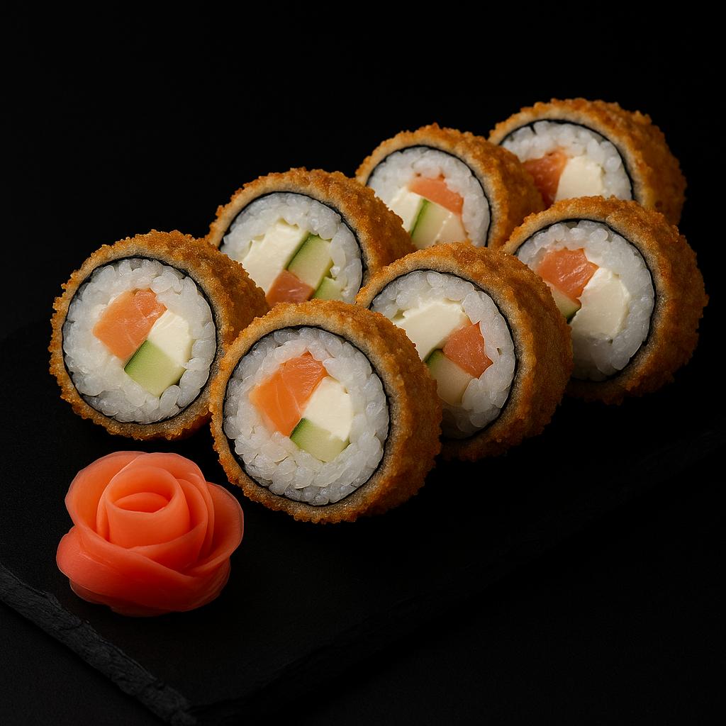 10 Piezas. Roll relleno de salmón, surimi, aguacate, cebollino y queso crema, tempurizado, empanizado y bañado en salsa anguila y salsa Fiji (mostaza miel de la casa). (Te mandamos salsa soya y salsa anguila).