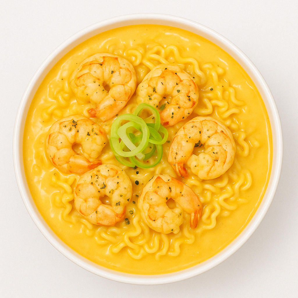 Fideos artesanales al estilo Coreano con camarones frescos, aderezo de queso y especies.