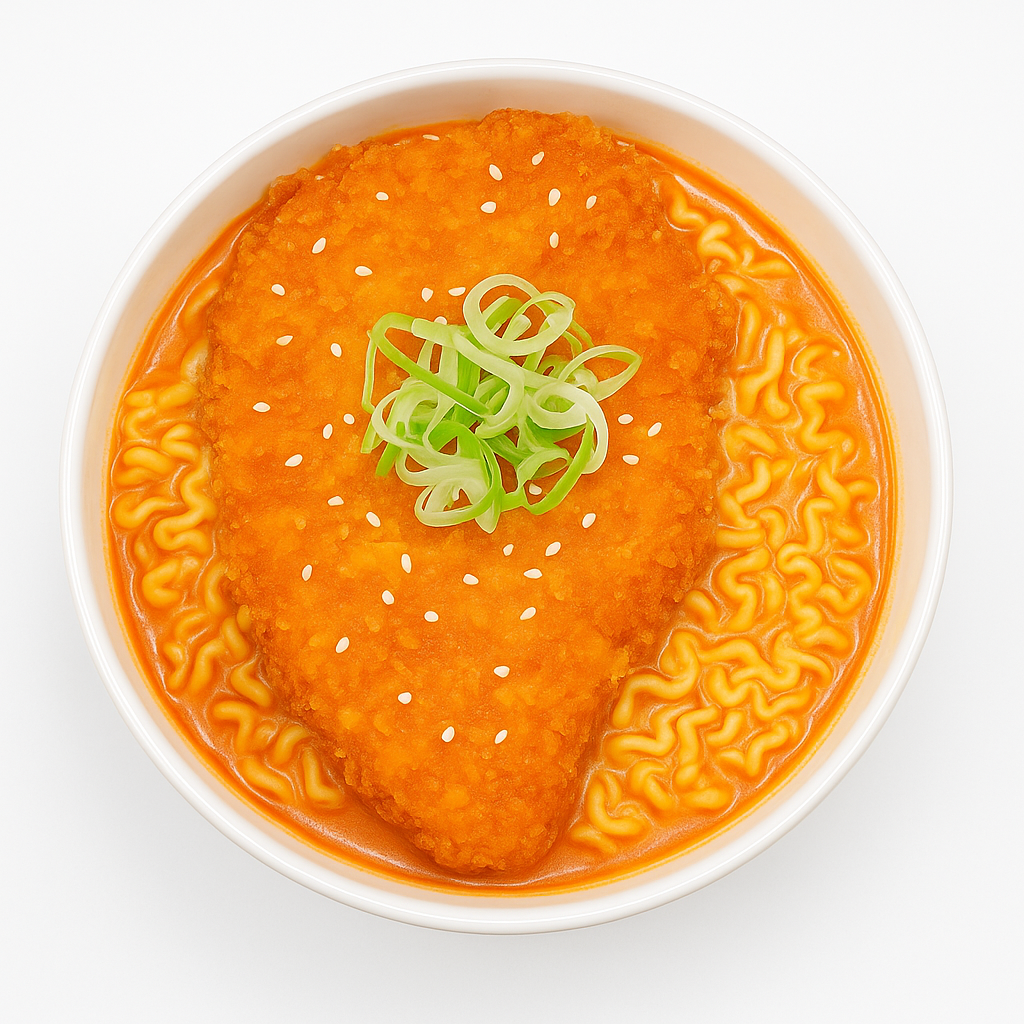 Fideos artesanales picantes al estilo Coreano con pechuga de pollo Katsu (empanizada) y especies.
