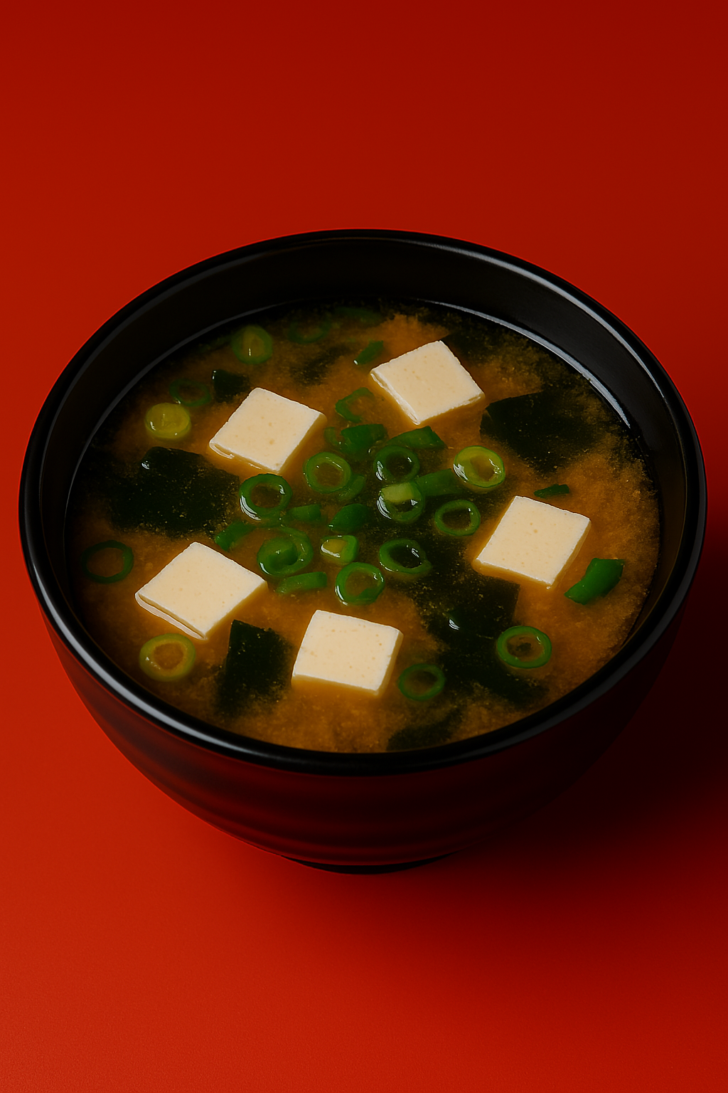 Caldo de Pasta de Soja, Alga, Wakame, Queso Tofu y Cebollino