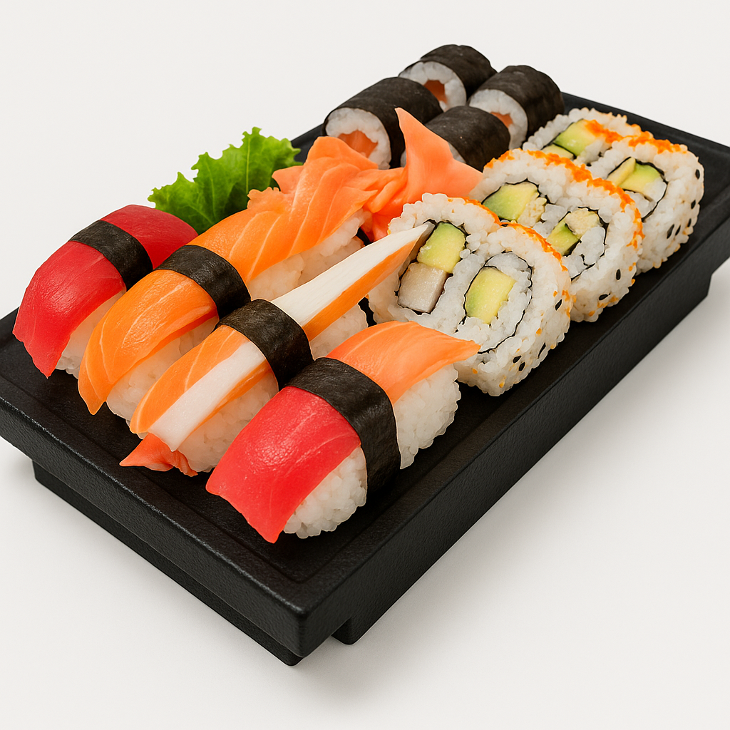 5 piezas de California Roll, relleno de kanikama, pepino y aguacate, cubierto con semillas de sésamo y huevitos de pescado. 4 nigiris surtidos (2 de atún y 2 de salmón), cubiertos con huevitos de pescado. 5 sashimis surtidos de atún y salmón. 10 tekamakis de atún. Incluye sopa miso y bebida. (Te mandamos salsa soya y salsa anguila).