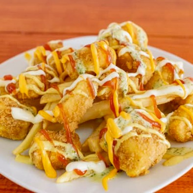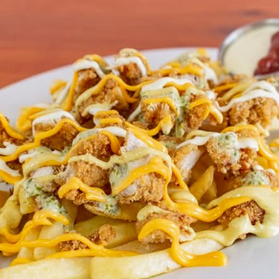 Combinación de deliciosas papas fritas crujientes, pollo picado y una deliciosa continuación de salsa únicas.