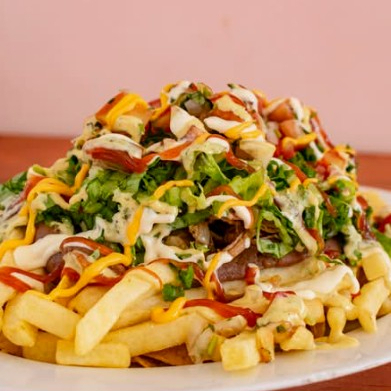 Combina papas fritas crujientes, salchichas, tocineta, queso derretido, cebolla caramelizada, guacamole y salsas de la casa.