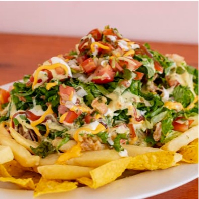 Papas fritas crujientes con carne mechada o pollo, pico de gallo, lechuga, queso y salsas.